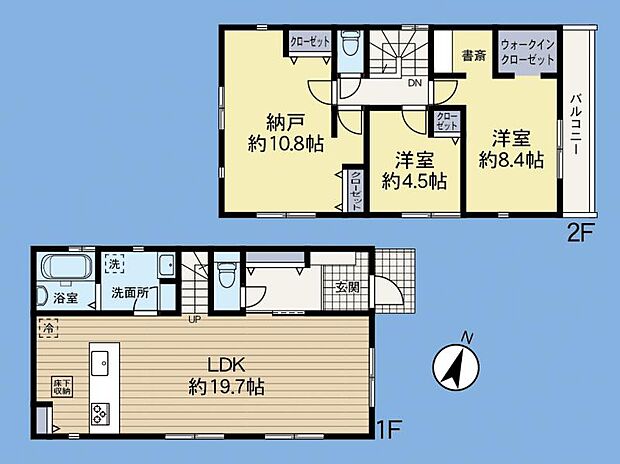 | 間取り | 2SLDK 間取り内訳:リビングダイニングキッチン 19.7帖(1階)・洋室 8.4帖(2階)・洋室 4.5帖(2階)・収納 10.8帖(2階) |
