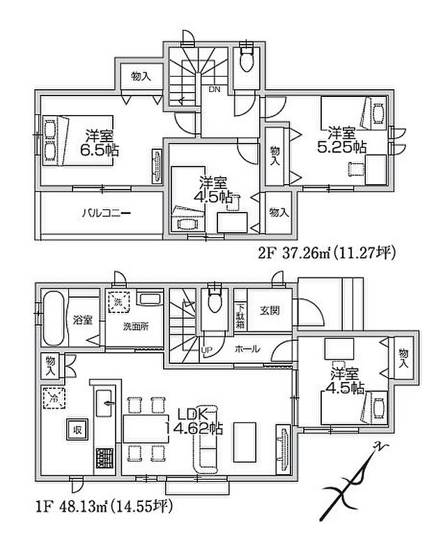 | 間取り | 4LDK 間取り内訳:洋室 6.5帖(2階)・洋室 5.2帖(2階)・洋室 4.5帖(2階)・洋室 4.5帖(1階)・リビングダイニングキッチン 14.6帖(1階) |