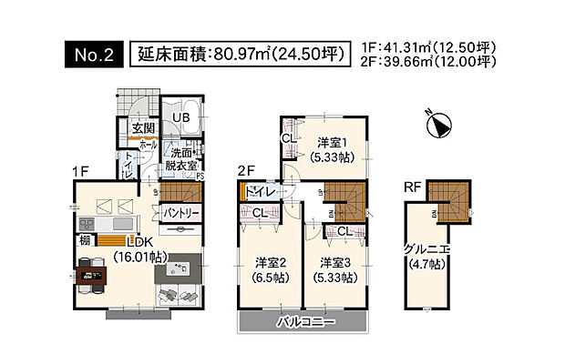 | 建物面積 | 80.97m2(2区画)~81.80m2(1区画) | ||