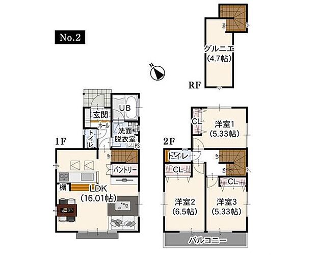 | 間取り | 3LDK 間取り内訳:リビングダイニングキッチン 16帖・洋室 6.5帖・洋室 5.3帖 |