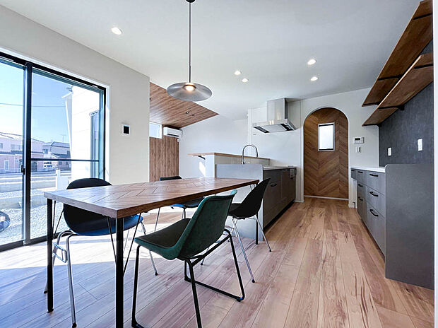 【見学可能】家具付き/太陽光パネル標準装備/駐車3台/こだわりキッチン空間と、勾配天井のある家 【間取り設計のポイント】 ・大容量のカップボードとパントリ―、冷蔵庫も隠せて見た目がスッキリ ・脱衣室と分かれた洗面室 ・廊下・洗面室・LDKの回遊動線 ・間仕切り可能な洋室 【環境ポイント】 ・交通量が少なく、子育てにも安心な分譲地 ・整備された歩道 ・駅まで平坦 ・広々な約45坪以上の敷地 ・こども園、小学校、中学校徒歩約14分以内