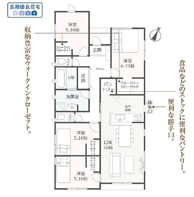 | 間取り | 4LDK 間取り内訳:リビングダイニングキッチン 16帖(1階)・洋室 6.7帖(1階)・洋室 5.1帖(1階)・洋室 5.1帖(1階)・洋室 5.1帖(1階) |