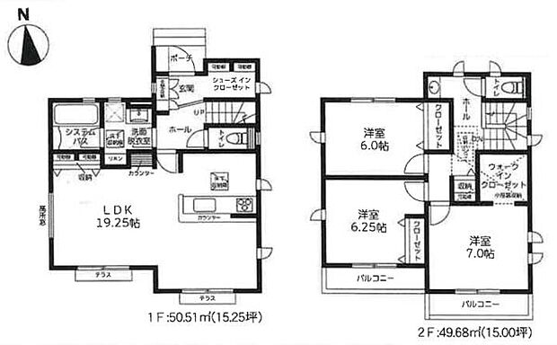 | 間取り | 3LDK 間取り内訳:リビングダイニングキッチン 19.2帖(1階)・洋室 7帖(2階)・洋室 6.2帖(2階)・洋室 6帖(2階) |