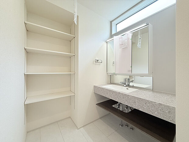 • 【洗面化粧台】東栄住宅の新仕様!ホテルのようなオシャレなデザインが特徴的な洗面化粧台。継ぎ目がないカウンターとオープン収納を採用しお手入れのしやすい仕様となっております。