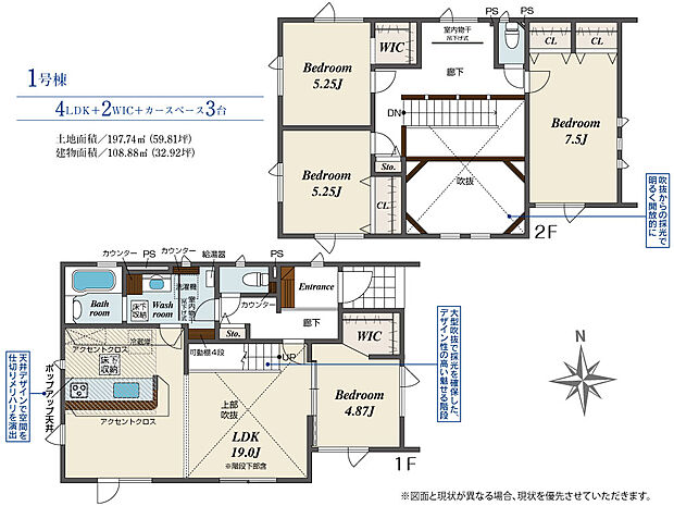 - 「建築条件付き土地」の「建物プラン例」は、土地購入者の設計プランの一例であり、プランの採用可否は任意です。