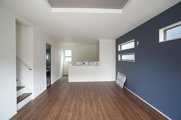 南道路の明るいお家、買い物環境良好な閑静な住宅地です。折り上げ天井のリビングは開放感のある空間に。