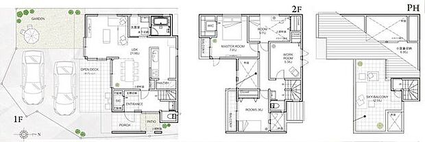 【12.5帖の大型スカイバルコニーでアウトドアラウンジを楽しめます】カースペース並列2台可!3つのバルコニーや吹抜で明るく陽当たり通風良好な空間です!
