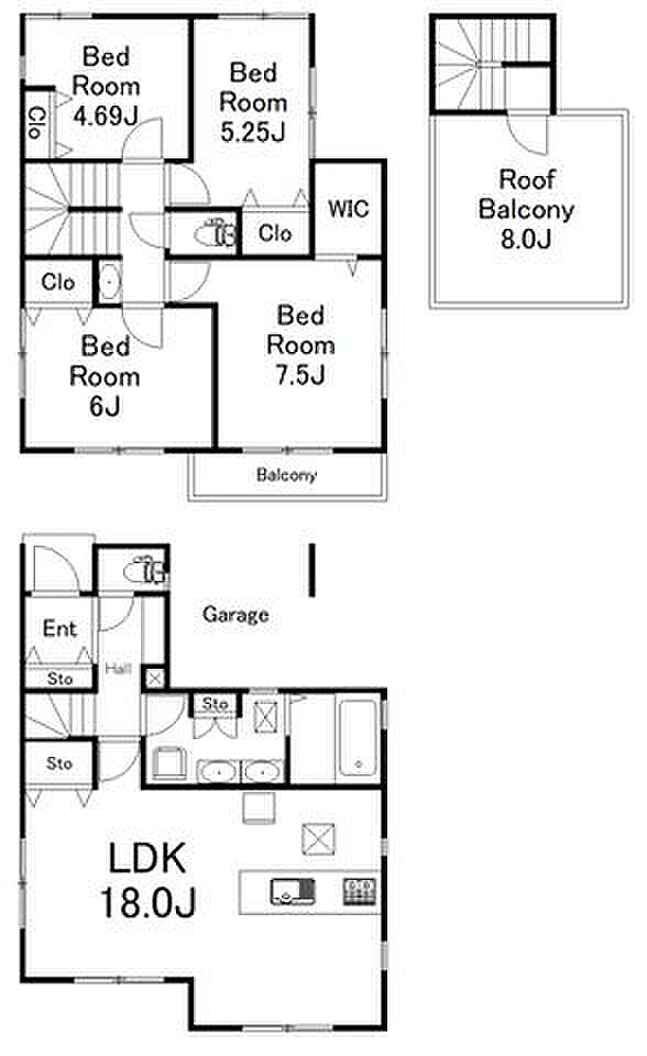 | 間取り | 4LDK 間取り内訳:リビングダイニングキッチン 18帖(1階)・洋室 7.5帖(1階)・洋室 6帖(2階)・洋室 5.2帖(2階)・洋室 4.6帖(2階) |