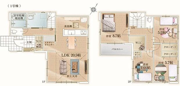 | 間取り | 4LDK 間取り内訳:洋室 8.7帖・洋室 5.7帖・洋室 5.2帖・洋室 4.6帖・リビングダイニングキッチン 20.5帖 |