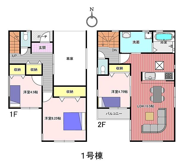 | 間取り | 3SLDK 間取り内訳:洋室 8帖(1階)・洋室 4.4帖(1階)・リビングダイニングキッチン 16.1帖(2階)・洋室 4.6帖(2階) |