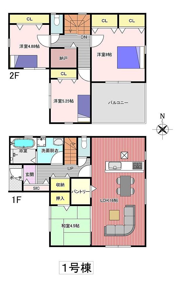 | 間取り | 4SLDK 間取り内訳:洋室 8帖(2階)・リビングダイニングキッチン 16帖(1階)・和室 4.5畳(1階)・洋室 4.8帖(2階)・洋室 5.2帖(2階) |