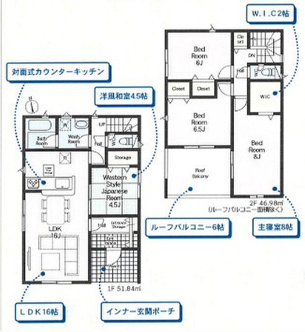 | 間取り | 4LDK 間取り内訳:和室 4.5畳(1階)・リビングダイニングキッチン 16帖(1階)・洋室 8帖(2階)・洋室 6.5帖(2階)・洋室 6帖(2階) |