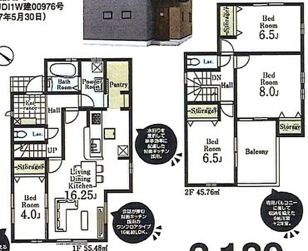 | 間取り | 4LDK 間取り内訳:リビングダイニングキッチン 16.2帖(1階)・洋室 4帖(1階)・洋室 6.5帖(2階)x2・洋室 8帖(2階) |