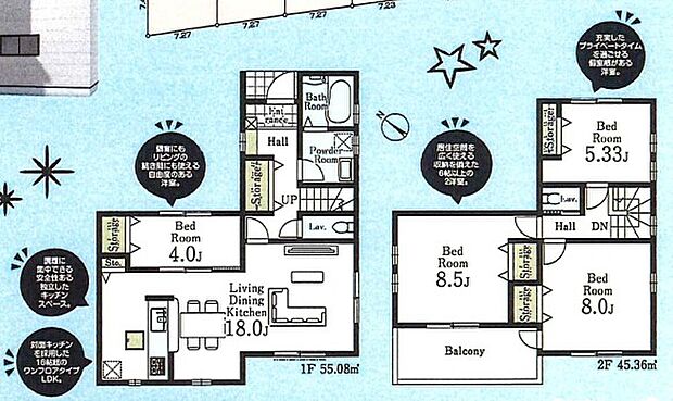 | 間取り | 4LDK 間取り内訳:リビングダイニングキッチン 18帖(1階)・洋室 4帖(1階)・洋室 5.3帖(2階)・洋室 8帖(2階)・洋室 8.5帖(2階) |
