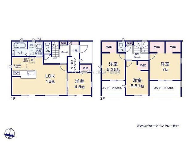 | 間取り | 4LDK 間取り内訳:リビングダイニングキッチン 16帖(1階)・洋室 4.5帖(1階)・洋室 7帖(2階)・洋室 5.8帖(2階)・洋室 5.2帖(2階) |