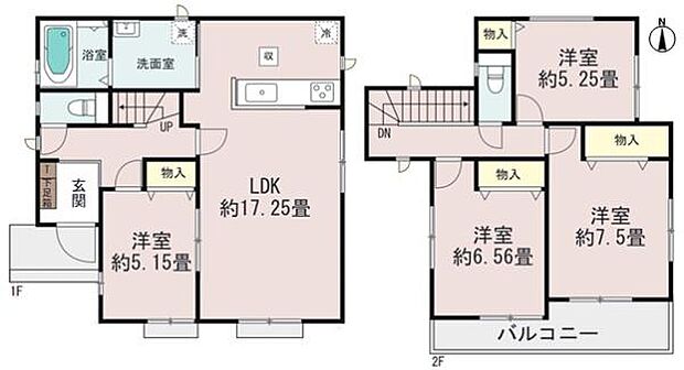 | 間取り | 4LDK 間取り内訳:リビングダイニングキッチン 17.2帖(1階)・洋室 5.1帖(1階)・洋室 7.5帖(2階)・洋室 6.5帖(2階)・洋室 5.2帖(2階) |