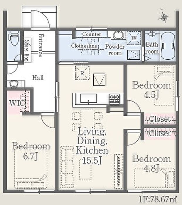 | 間取り | 3LDK 間取り内訳:リビングダイニングキッチン 15.5帖(1階)・洋室 6.7帖(2階)・洋室 4.8帖(2階)・洋室 4.5帖(1階) |