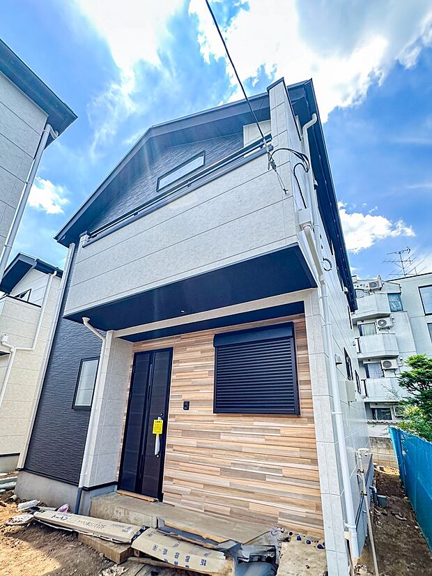 • 2号棟【現地外観】堂々たる趣ながら、主張し過ぎずどこか余裕を感じさせるシャープなフォルムで佇む邸宅は、晴天の空と照らし合わせる事で、本来あるべき完成形の姿を見せてくれます。