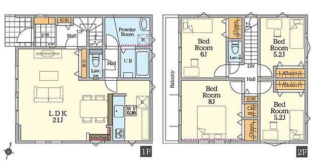 | 間取り | 4LDK 間取り内訳:リビングダイニングキッチン 21帖(1階)・洋室 8帖(2階)・洋室 6帖(2階)・洋室 5.2帖(2階)・洋室 5.2帖(2階) |