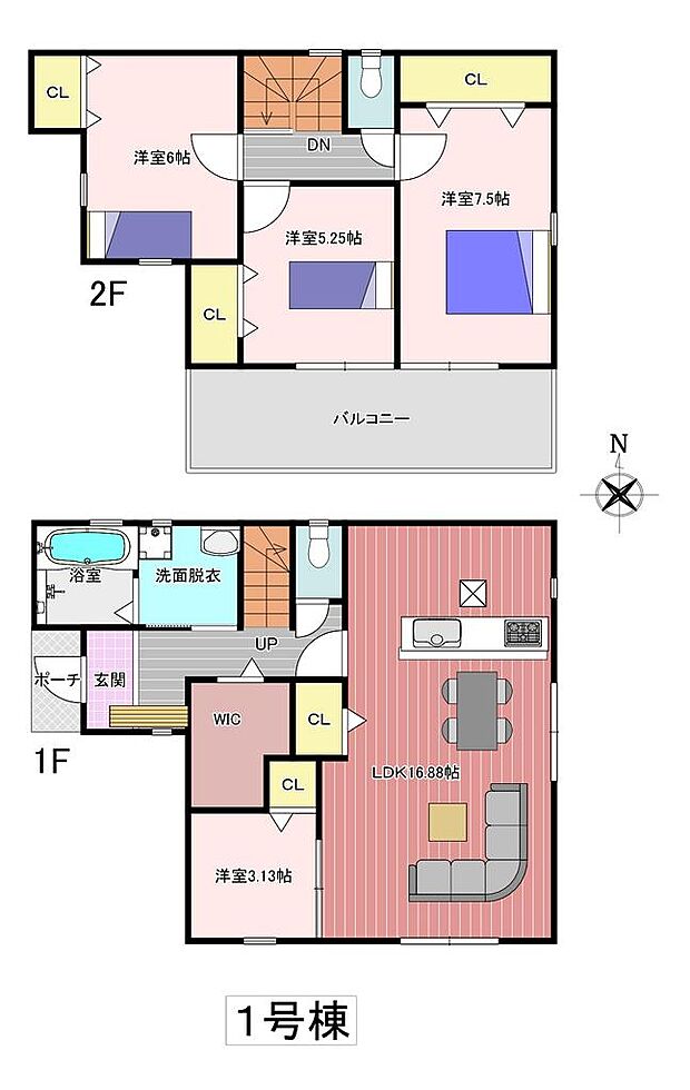| 間取り | 4LDK 間取り内訳:リビングダイニングキッチン 16.8帖(1階)・洋室 3.1帖(1階)・洋室 5.2帖(2階)・洋室 6帖(2階)・洋室 7.5帖(2階) |