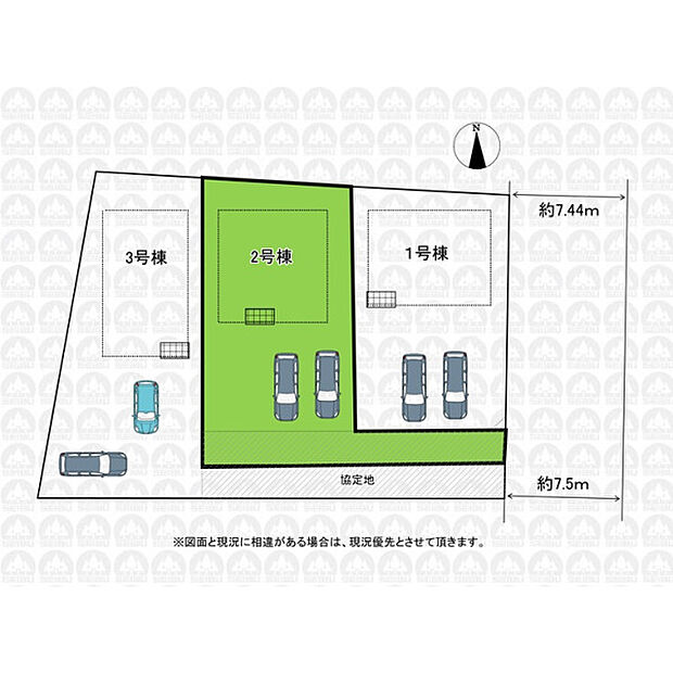 カースペース2台可並列(車種による)/南側協定道路につき陽当たり良好/土地正味57坪/ルーフバルコニー付き