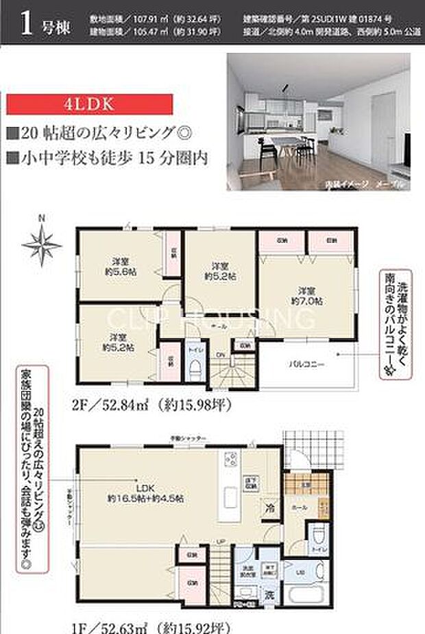| 間取り | 4LDK 間取り内訳:洋室 5.6帖(2階)・洋室 5.2帖(2階)・洋室 5.2帖(2階)・リビングダイニングキッチン 21帖(1階)・洋室 7帖(2階) |
