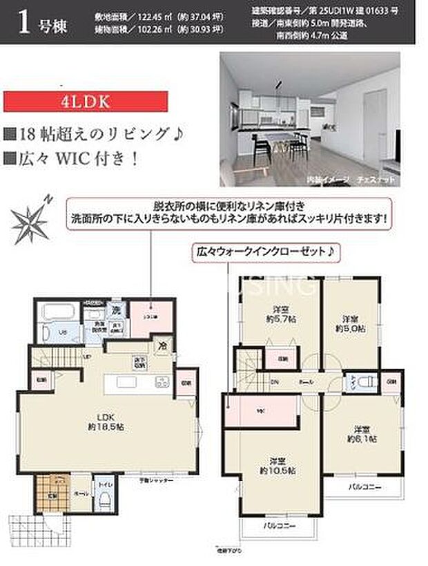 | 間取り | 4LDK 間取り内訳:リビングダイニングキッチン 18.5帖(1階)・洋室 10.5帖(2階)・洋室 6.1帖(2階)・洋室 5.7帖(2階)・洋室 5帖(2階) |