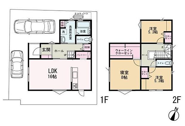 | 間取り | 3SLDK 間取り内訳:リビングダイニングキッチン 16帖(1階)・洋室 8帖(2階)・洋室 5.3帖(2階)・洋室 5.3帖(2階) |