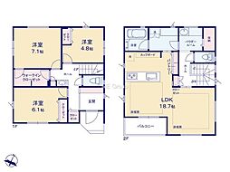 | 間取り | 3LDK 間取り内訳:リビングダイニングキッチン 18.7帖(2階)・洋室 6.1帖(1階)・洋室 7.1帖(1階)・洋室 4.8帖(1階) |