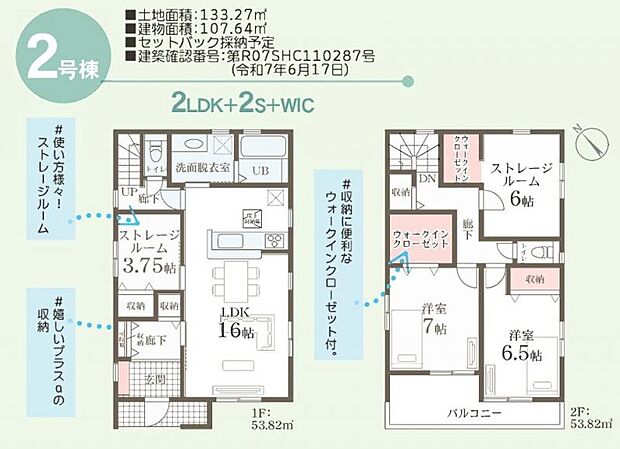 | 間取り | 2SLDK 間取り内訳:リビングダイニングキッチン 16帖(1階)・収納 3.7帖(1階)・洋室 7帖(2階)・洋室 6.5帖(2階)・収納 6帖(2階) |