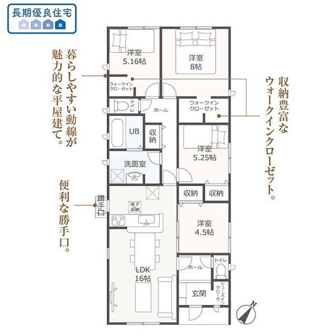 | 間取り | 4LDK 間取り内訳:リビングダイニングキッチン 16帖(1階)・洋室 8帖(1階)・洋室 5.2帖(1階)・洋室 5.1帖(1階)・洋室 4.5帖(1階) |