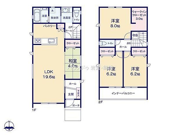 間取り内訳:リビングダイニングキッチン 19.6帖(1階)・和室 4畳(1階)・洋室 8帖(2階)・洋室 6.2帖(2階)・洋室 6.2帖(2階)
