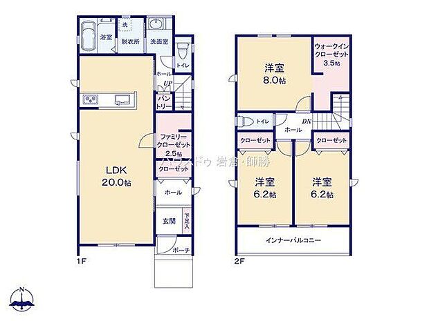 | 間取り | 3LDK 間取り内訳:リビングダイニングキッチン 20帖(1階)・洋室 8帖(2階)・洋室 6.2帖(2階)・洋室 6.2帖(2階) |