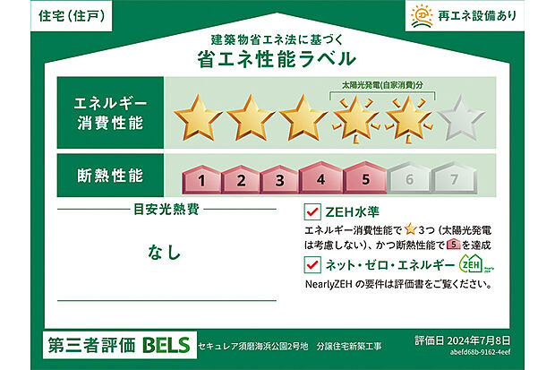 - 星マークの数が多いほどエネルギー消費性能が高いことを示しています。再エネ設備のない住宅は★0~★4の5段階評価、再エネ設備がある住宅は★0~★6の7段階評価となります。