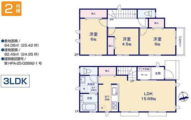 | 間取り | 3LDK 間取り内訳:リビングダイニングキッチン 15.6帖(1階)・洋室 6帖(2階)・洋室 6帖(2階)・洋室 4.5帖(2階) |