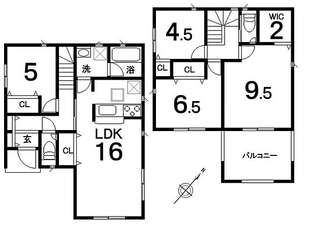 間取り内訳:リビングダイニングキッチン 16帖(1階)・洋室 5帖(1階)・洋室 9.5帖(2階)・洋室 6.5帖(2階)・洋室 4.5帖(2階)