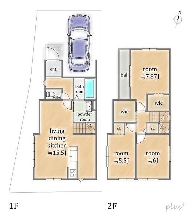 | 間取り | 3LDK 間取り内訳:リビングダイニングキッチン 15.5帖(1階)・洋室 7.8帖(2階)・洋室 6帖(2階)・収納 5.5帖(2階) |