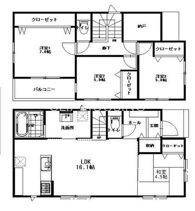 | 間取り | 4LDK 間取り内訳:リビングダイニングキッチン 18.1帖(1階)・和室 4.5畳(1階)・洋室 7帖(2階)・洋室 5帖(2階)・洋室 5帖(2階) |