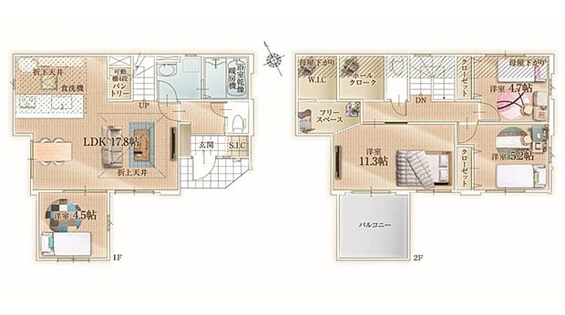 | 間取り | 4LDK 間取り内訳:リビングダイニングキッチン 17.8帖・洋室 11.3帖・洋室 5.2帖・洋室 4.7帖・洋室 4.5帖 |