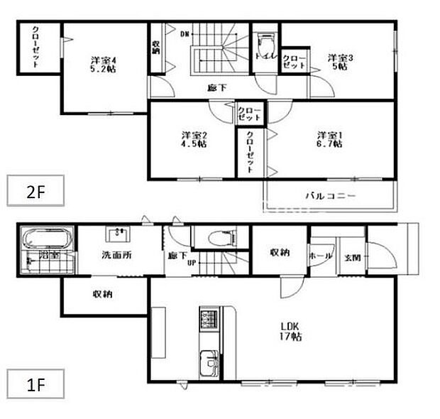 | 間取り | 4LDK 間取り内訳:リビングダイニングキッチン 17帖(1階)・洋室 8.7帖(2階)・洋室 5帖(2階)・洋室 4.5帖(2階)・洋室 5.2帖(2階) |