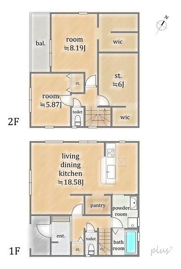 | 間取り | 2SLDK 間取り内訳:リビングダイニングキッチン 18.5帖(1階)・洋室 8.1帖(2階)・洋室 5.8帖(2階)・収納 6帖(2階) |