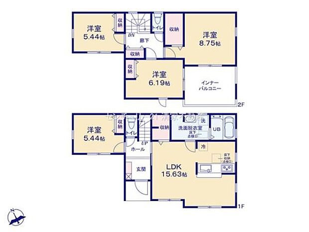 | 間取り | 4LDK 間取り内訳:リビングダイニングキッチン 15.6帖(1階)・洋室 5.4帖(1階)・洋室 8.7帖(2階)・洋室 6.1帖(2階)・洋室 5.4帖(2階) |