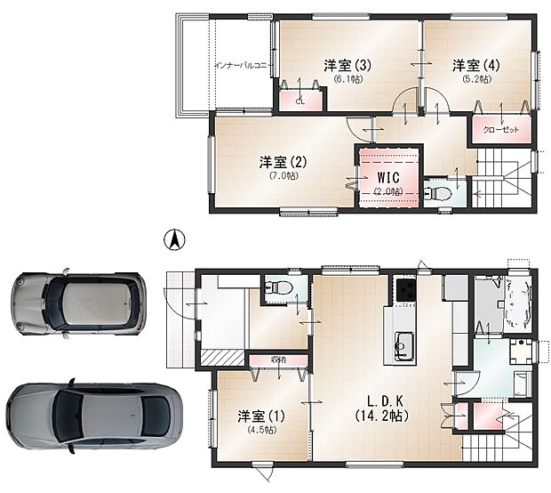 | 間取り | 4SLDK 間取り内訳:リビングダイニングキッチン 14.2帖(1階)・洋室 4.5帖(1階)・洋室 7帖(2階)・洋室 6.1帖(2階)・洋室 5.2帖(2階) |