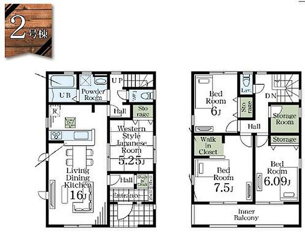 | 間取り | 4LDK 間取り内訳:リビングダイニングキッチン 16帖(1階)・和室 5.2畳(1階)・洋室 7.5帖(2階)・洋室 6帖(2階)・洋室 6帖(2階) |