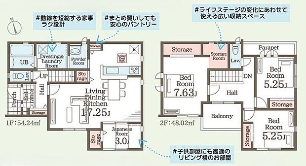 | 間取り | 4LDK 間取り内訳:リビングダイニングキッチン 17.2帖(1階)・和室 3畳(1階)・洋室 7.6帖(2階)・洋室 5.2帖(2階)・洋室 5.2帖(2階) |