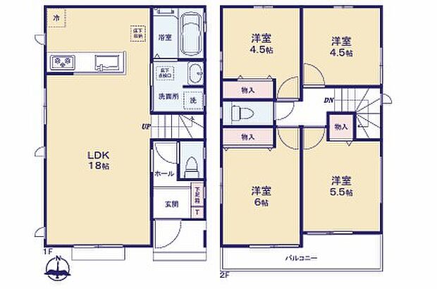 | 間取り | 4LDK 間取り内訳:リビングダイニングキッチン 18帖(1階)・洋室 4.5帖(2階)x2・洋室 6帖(2階)・洋室 5.5帖(2階) |