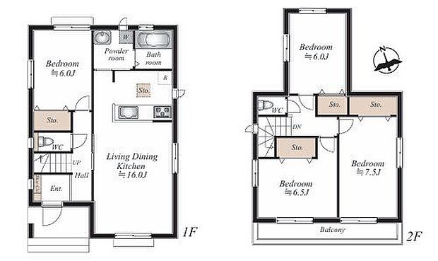 | 間取り | 4LDK 間取り内訳:リビングダイニングキッチン 16帖(1階)・洋室 6帖(1階)・洋室 7.5帖(2階)・洋室 6.5帖(2階)・洋室 6帖(2階) |
