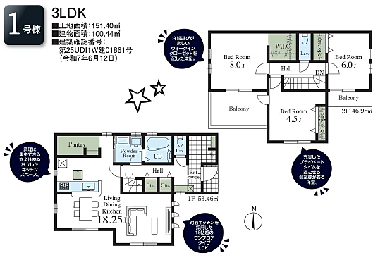 | 間取り | 3LDK 間取り内訳:リビングダイニングキッチン 18.2帖(1階)・洋室 8帖(2階)・洋室 6帖(2階)・洋室 4.5帖(2階) |