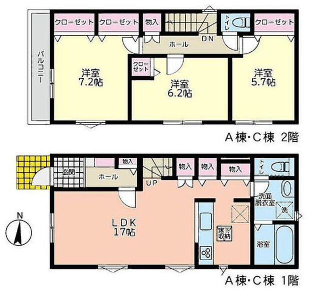 | 間取り | 3LDK 間取り内訳:洋室 7.2帖(2階)・洋室 6.2帖(2階)・洋室 5.7帖(2階)・リビングダイニングキッチン 17帖(1階) |