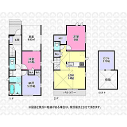 | 間取り | 2SLDK 間取り内訳:洋室 5.2帖(1階)・収納 4.5帖(1階)・リビングダイニングキッチン 14帖(2階)・洋室 6帖(2階)・その他 3.7帖(2階) |